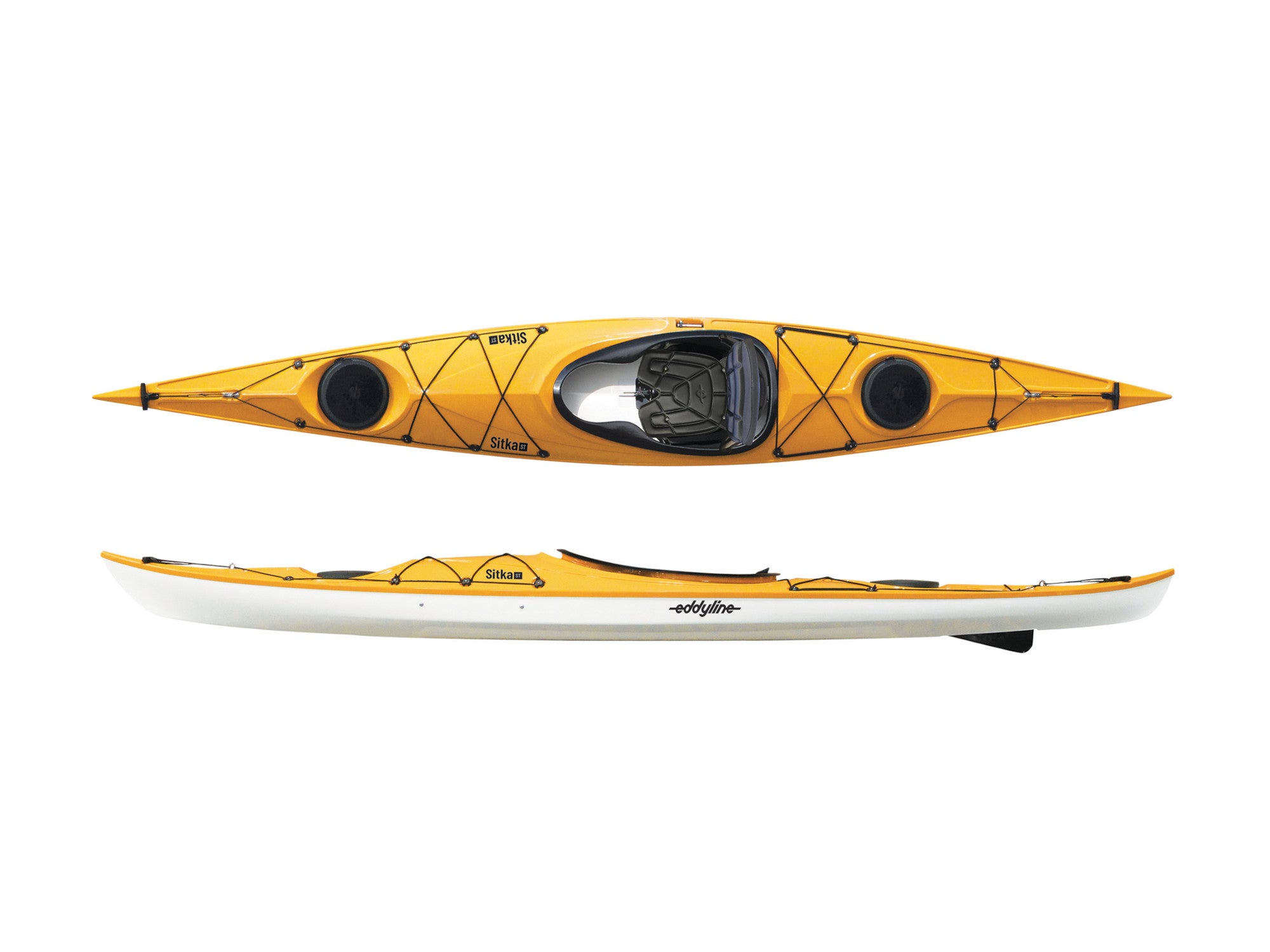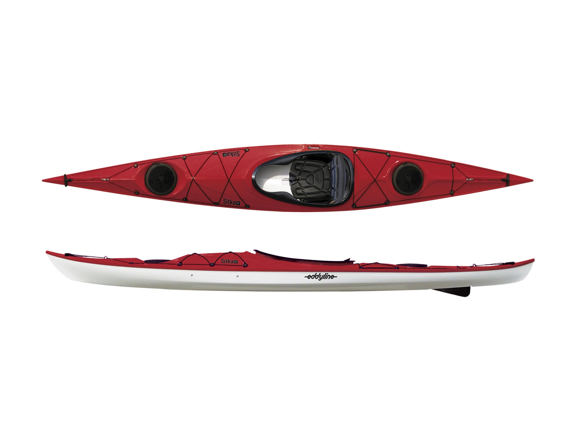 Sitka day-touring kayaks are designed for the paddler looking for a lightweight, high performing kayak with effortless maneuverability, and a perfect fit. The Sitka is ready for a saltwater adventure or a lazy afternoon at the lake. The Sitka combines the best of both worlds - the performance, efficiency and tracking of Eddylines Fathom touring kayaks, together with the playful nimble spirit of a recreational kayak. Eddyline Sitka kayaks are fully outfitted seaworthy kayaks with perimeter lines, bulkheads and hatches, retractable carry handles, deck bungees and Infinity Seat System with backrest (standard) or backband (optional). Each kayak also sports an adjustable drop down skeg for a wider range of hull performance.