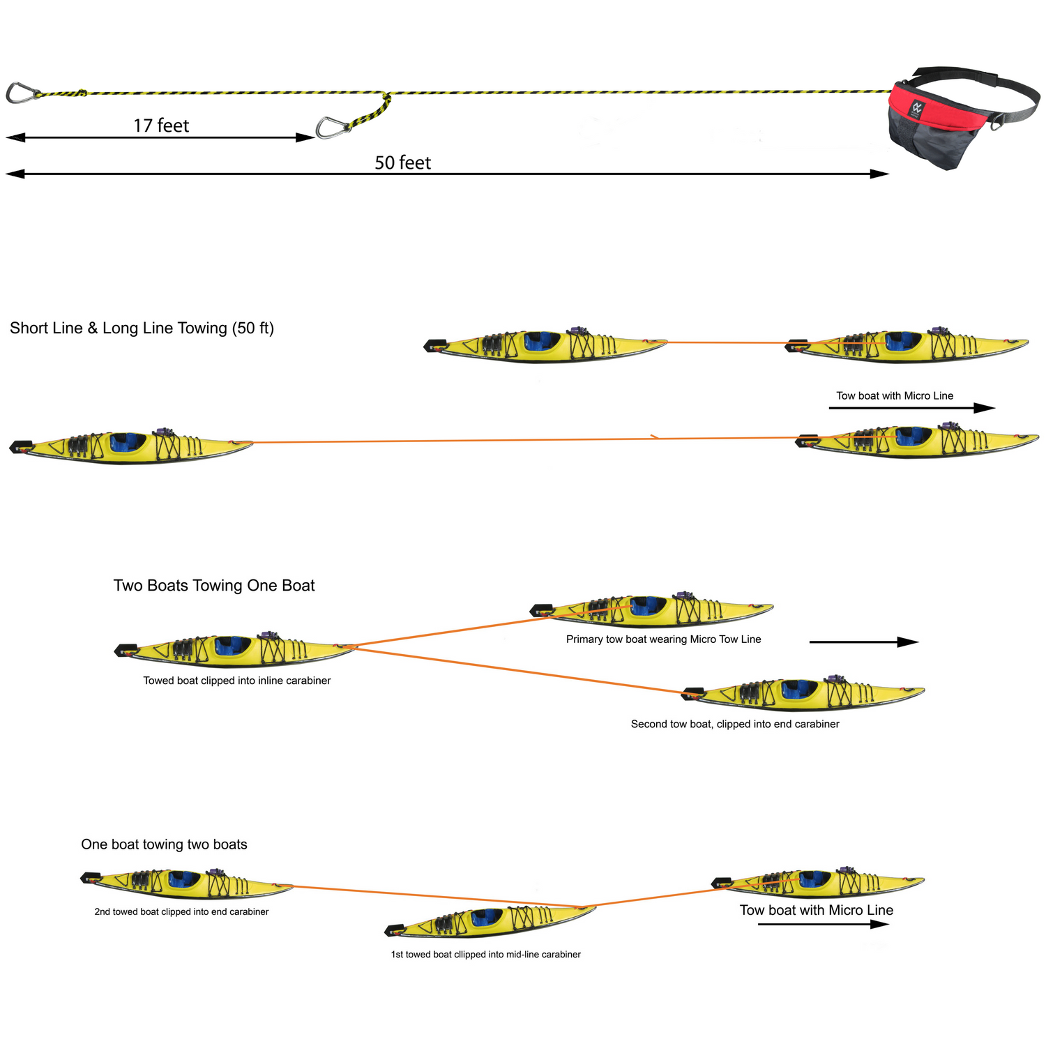 This waist worn tow system accommodates a pre-set but adjustable short or long tow. Two light weight carabiners give you up to 75 pound towing strength and are anchored to the outside of the pouch on either side for immediate access. Unclip one biner for a short tow then unclip the other for a long tow. If you need to tow two boats it is already set up.
