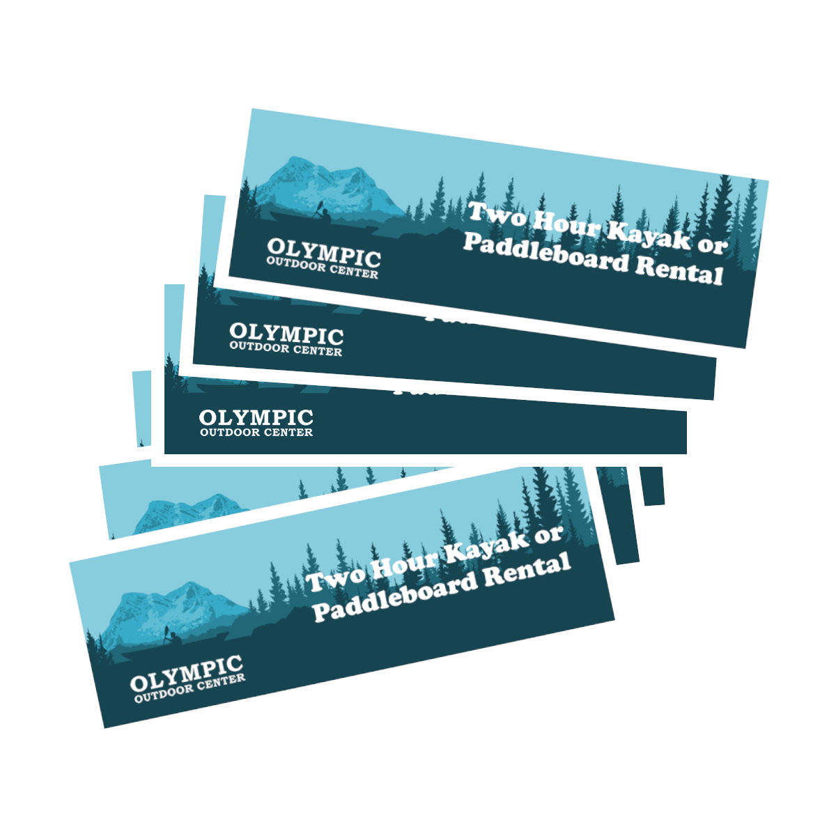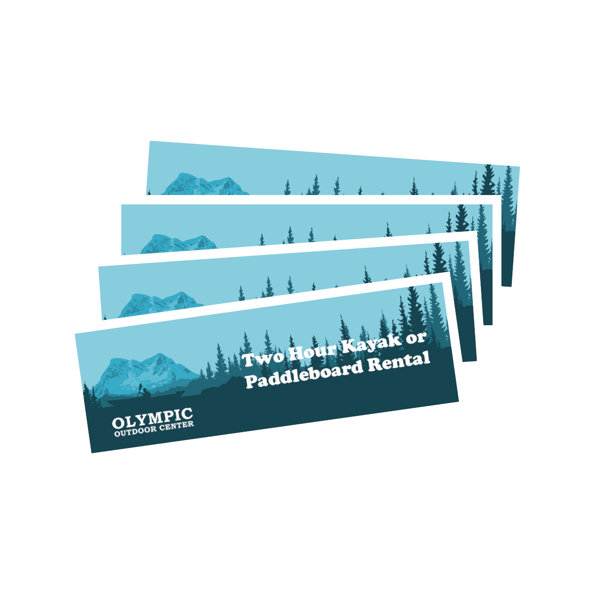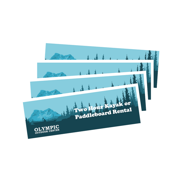 Libro de cinco (5) cupones, cada uno de los cuales se puede canjear por un alquiler de un kayak individual o una tabla de remo de una hora en cualquiera de las ubicaciones de Puget Sound del Olympic Outdoor Center. Todos los alquileres incluyen embarcación o tabla, dispositivo de flotación personal, remo, así como instrucción básica y charla de seguridad. Combina dos cupones para un alquiler de kayak doble o amplía tu tiempo de alquiler.
